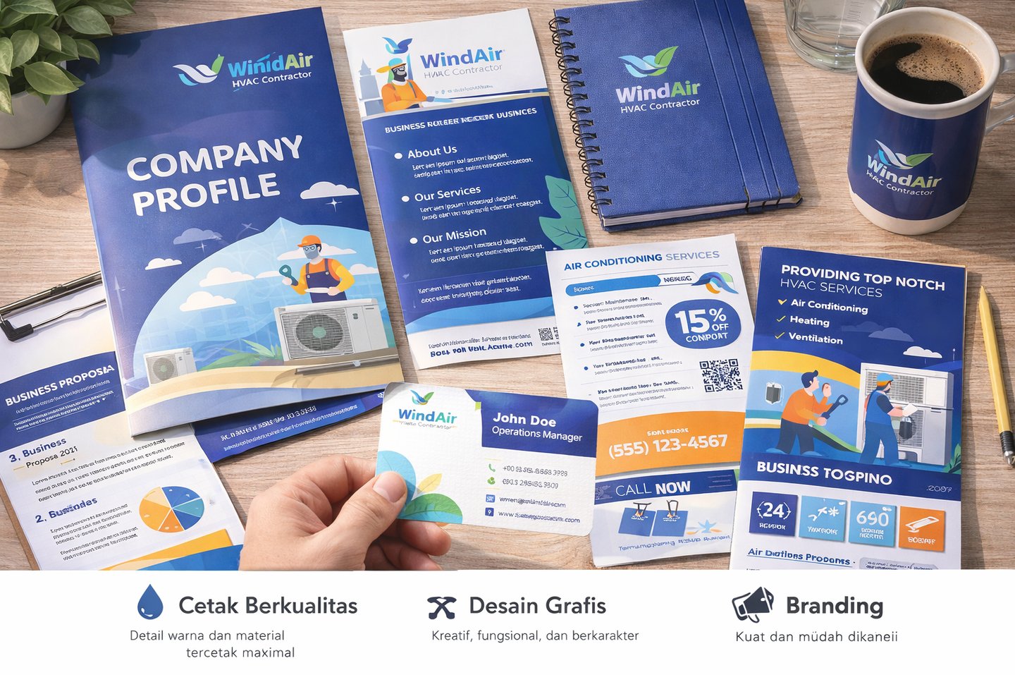 Kami menyediakan jasa desain dan cetak berkualitas untuk memenuhi kebutuhan promosi dan branding Anda. Dengan konsep desain yang rapi, modern, dan komunikatif, kami membantu menyampaikan pesan bisnis Anda secara tepat dan berkelas.